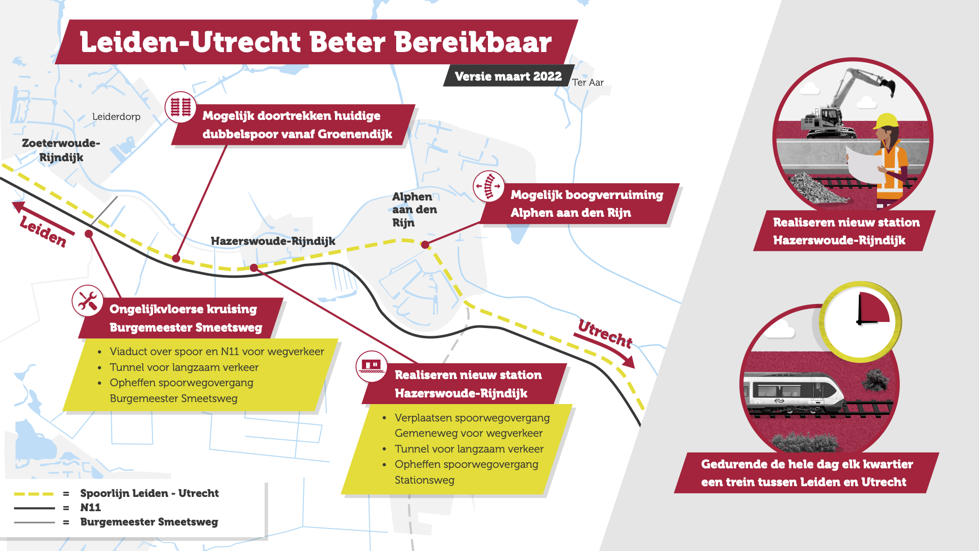 Dankzij een extra investering van 56 miljoen in een plan voor een betere treindienst in de regio tussen Leiden en Utrecht, wordt er een viaduct boven de N11 en het spoor bij de Burgemeester Smeetsweg in Zoeterwoude gerealiseerd. Daardoor wordt het spooroverweg die de Smeetsweg kruist overbodig en kunnen vier treinen per uur tussen Leiden en Utrecht gaan rijden.