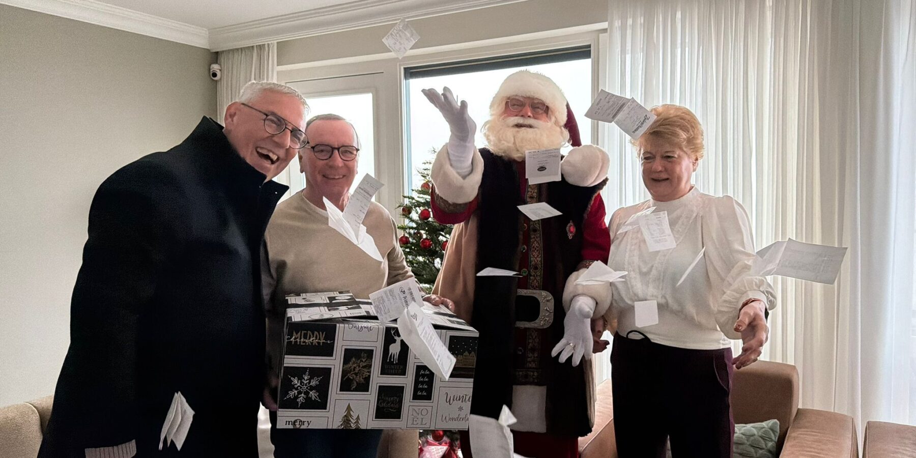 De Kerstman en wethouder Herman Romeijn zijn zaterdag bewapend met vijf winterpakketten door het dorp getrokken. Zij hebben de laatste winnaars van de koop lokaal actie ‘Shop in Leiderdorp’ verrast.