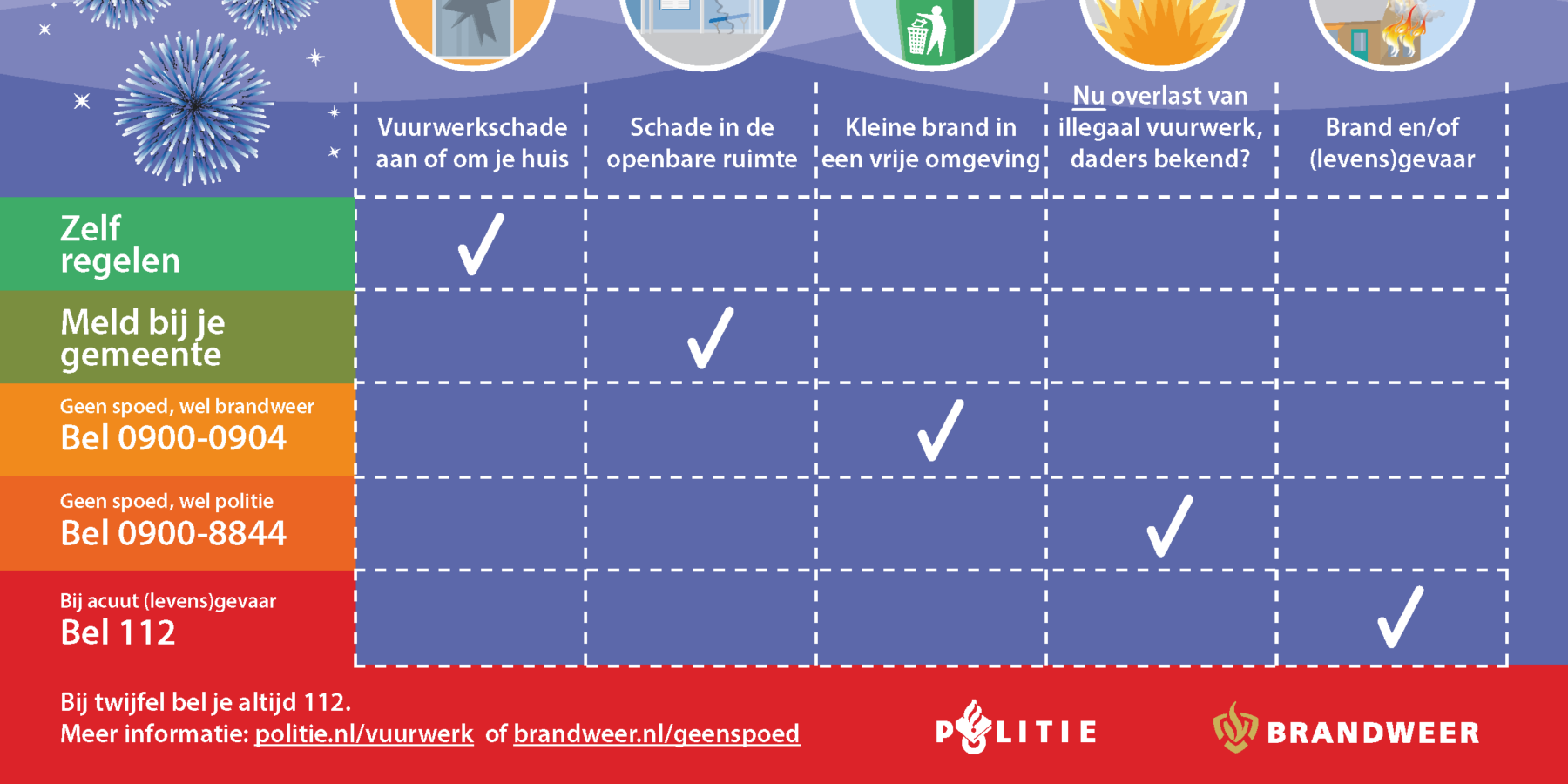 Bij een grote brand en (levens)gevaar moet er altijd 112 gebeld worden en bij schade aan je eigen huis hoeven de hulpverleners niet gebeld te worden. Wanneer je illegaal vuurwerk ziet is 112 (meestal) niet nodig, maar kan de politie wel gebeld worden op 0900-8844.