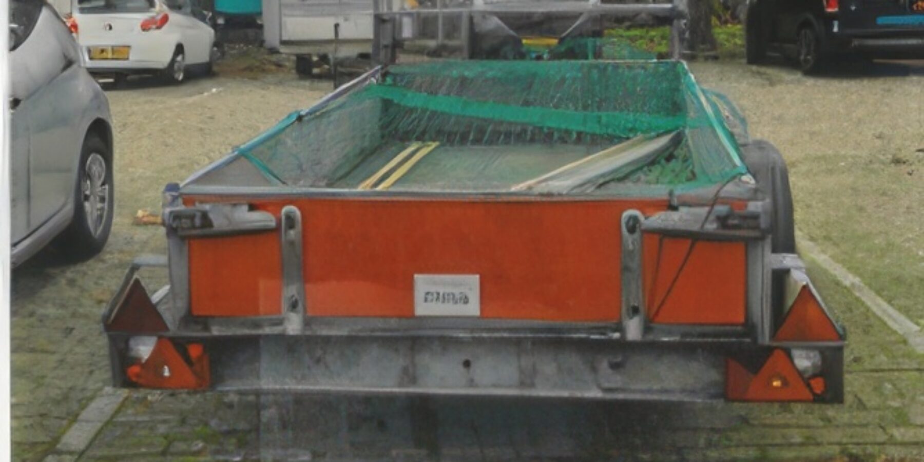 De aanhangwagen is rood van kleur en is afgedekt met een groen net. Het kenteken en merk van het voertuig zijn niet bekend.