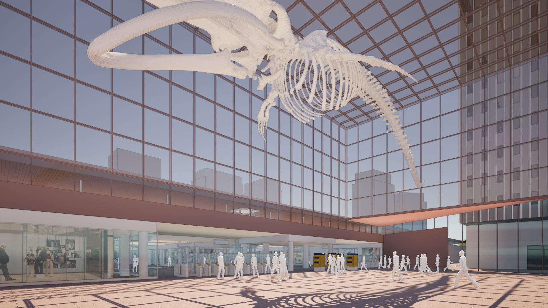 In die twee entrees, net als nu één aan de kant van de stad en één aan de kant van het Leiden Bio Science Park, komen bijzondere verwijzingen naar de Sleutelstad. Aan de kant van het centrum worden lakens opgehangen, als verwijzing naar de tijd dat Leiden wereldberoemd was om haar lakenindustrie. Aan de andere kant wordt een enorm skelet van een walvis aan het plafond gehangen. Dat symboliseert de toekomst en vormt de entree naar die Leiden Bio Science Park.