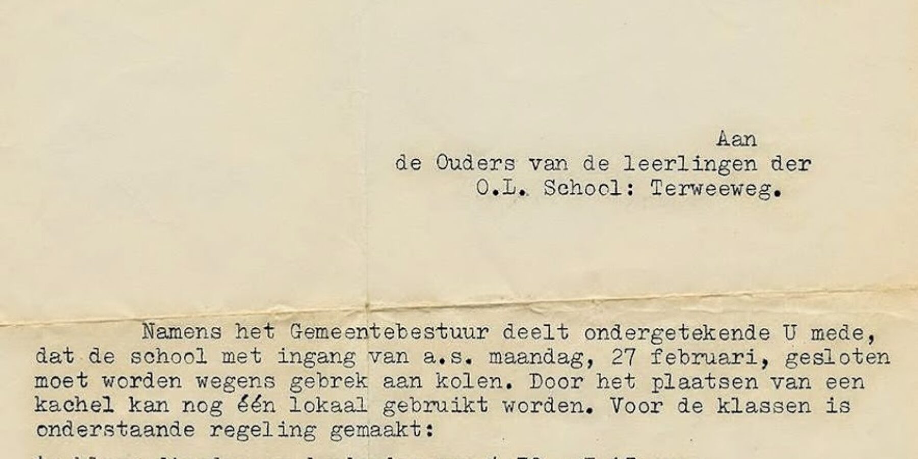 Basisschool Terweeweg uit Oegstgeest is per 27 februari gesloten vanwege een gebrek aan kolen, in combinatie met de kou. Directeur van Leeuwen stuurde hierover namens het gemeentebestuur een brief aan alle ouders. De brief dateert uit 1956 en dook op via de Facebookpagina ‘Je bent Oegstgeestenaar als’.