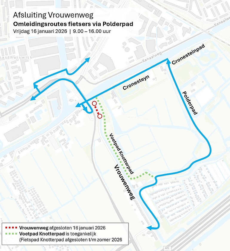 Fietsers worden tijdens de afsluiting omgeleid via het Polderpad. Autoverkeer op de route van de Vrouwenweg naar de Vlietweg, via de onderdoorgang onder de Lammebrug, is niet mogelijk. Verkeer van en naar Park Cronesteyn via de Vlietweg kan wel doorgang vinden via de onderdoorgang onder de Lammebrug. Weggebruikers wordt geadviseerd rekening te houden met extra reistijd.