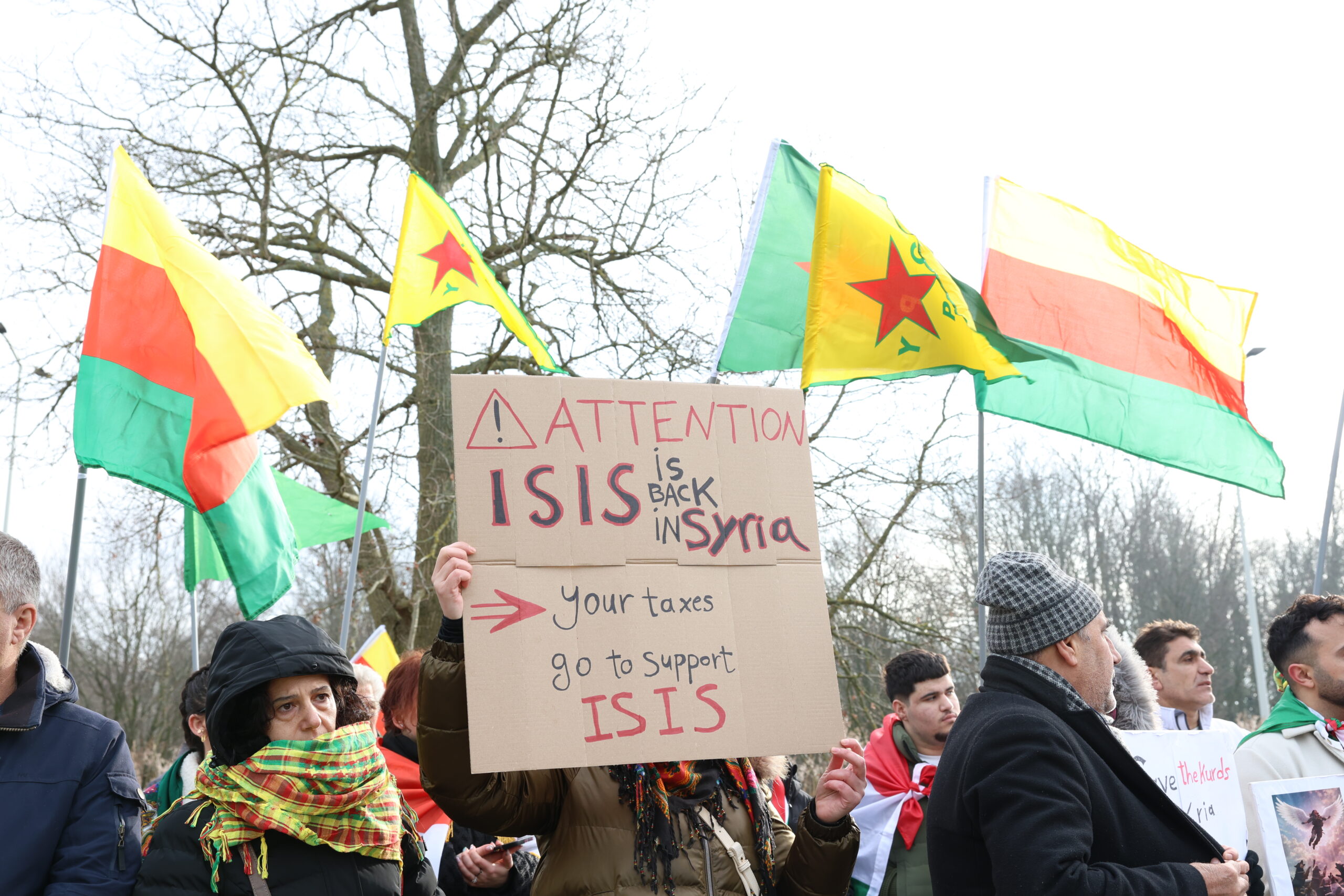 De protesteerders zien dat de Koerdische gemeenschap in Syrië steeds meer onder druk wordt gezet. Op borden is ook te lezen dat de Amerikaanse ambassadeur in Turkije en door President Trump benoemd tot speciale gezant voor Syrië, Tom Barrack, de opkomst van IS in Syrië zou aanmoedigen.