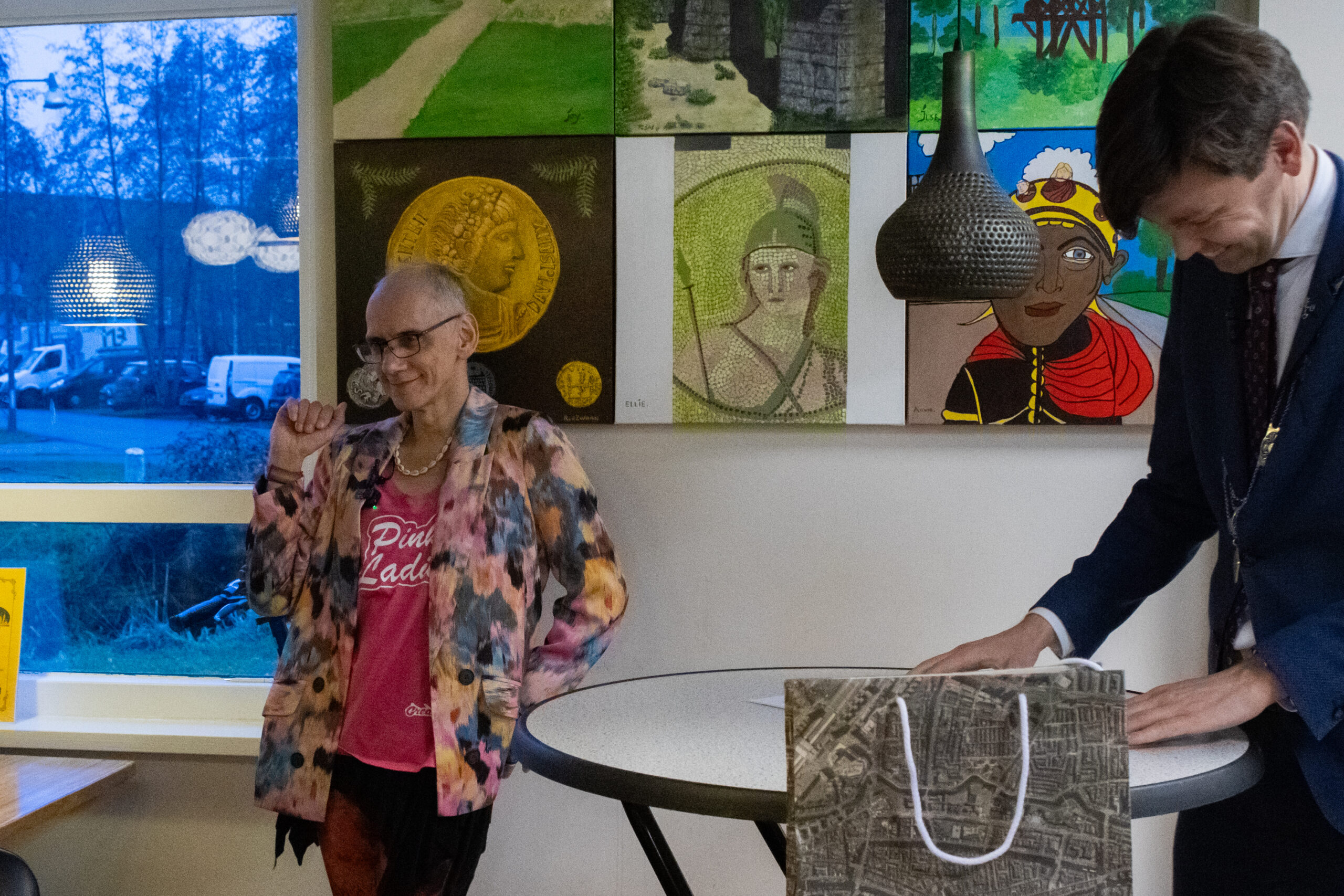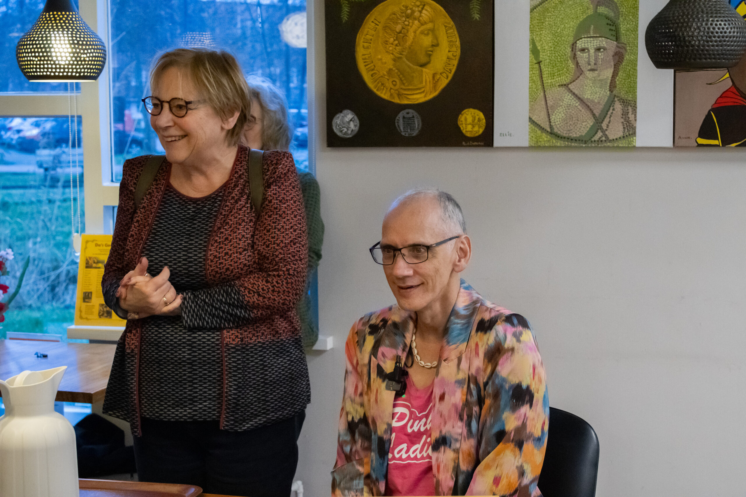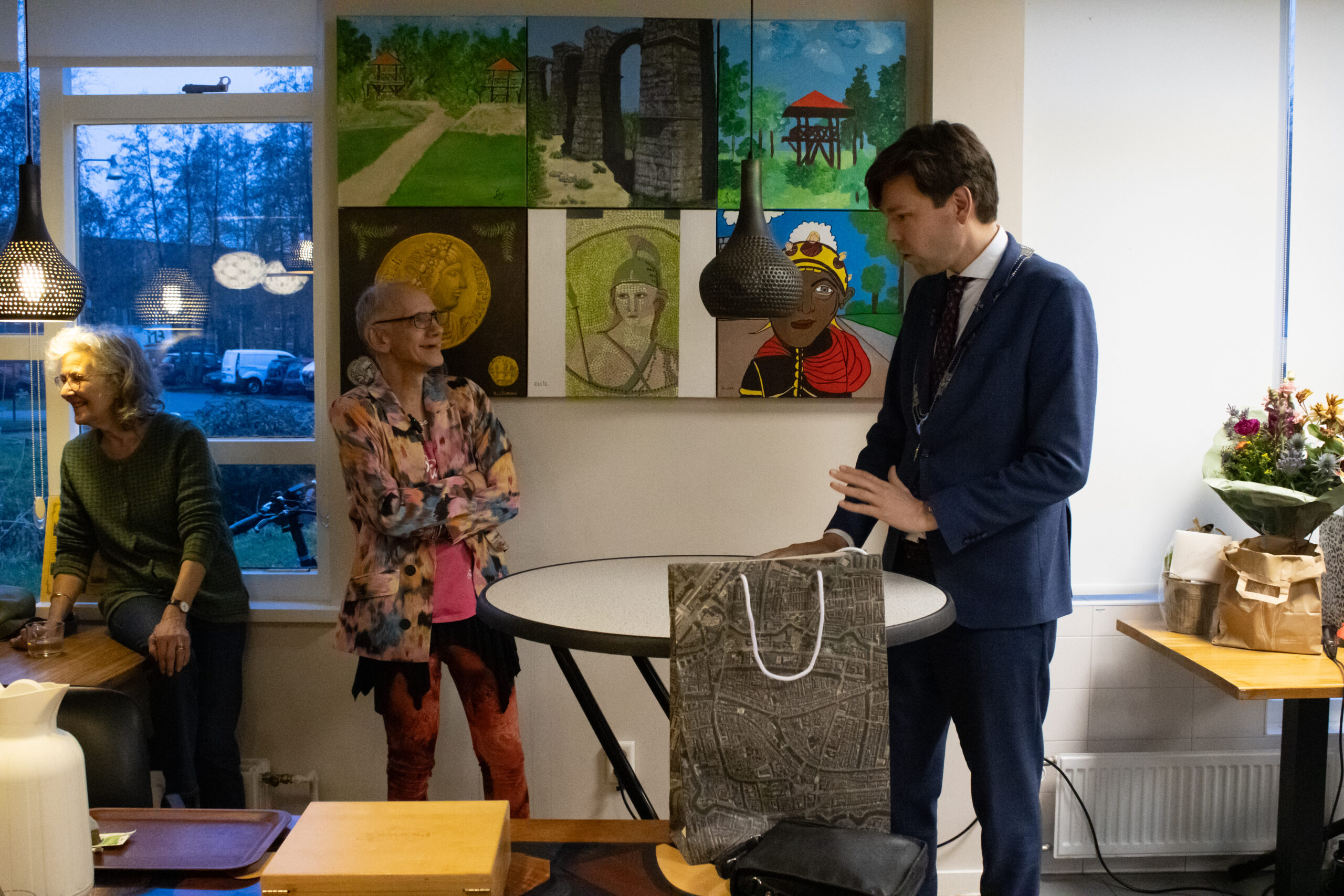 Verslaggever Jennifer Wijnen in gesprek met locoburgemeester Julius Terpstra over het onderscheiden van het Cornelis Joppensz Beeldje