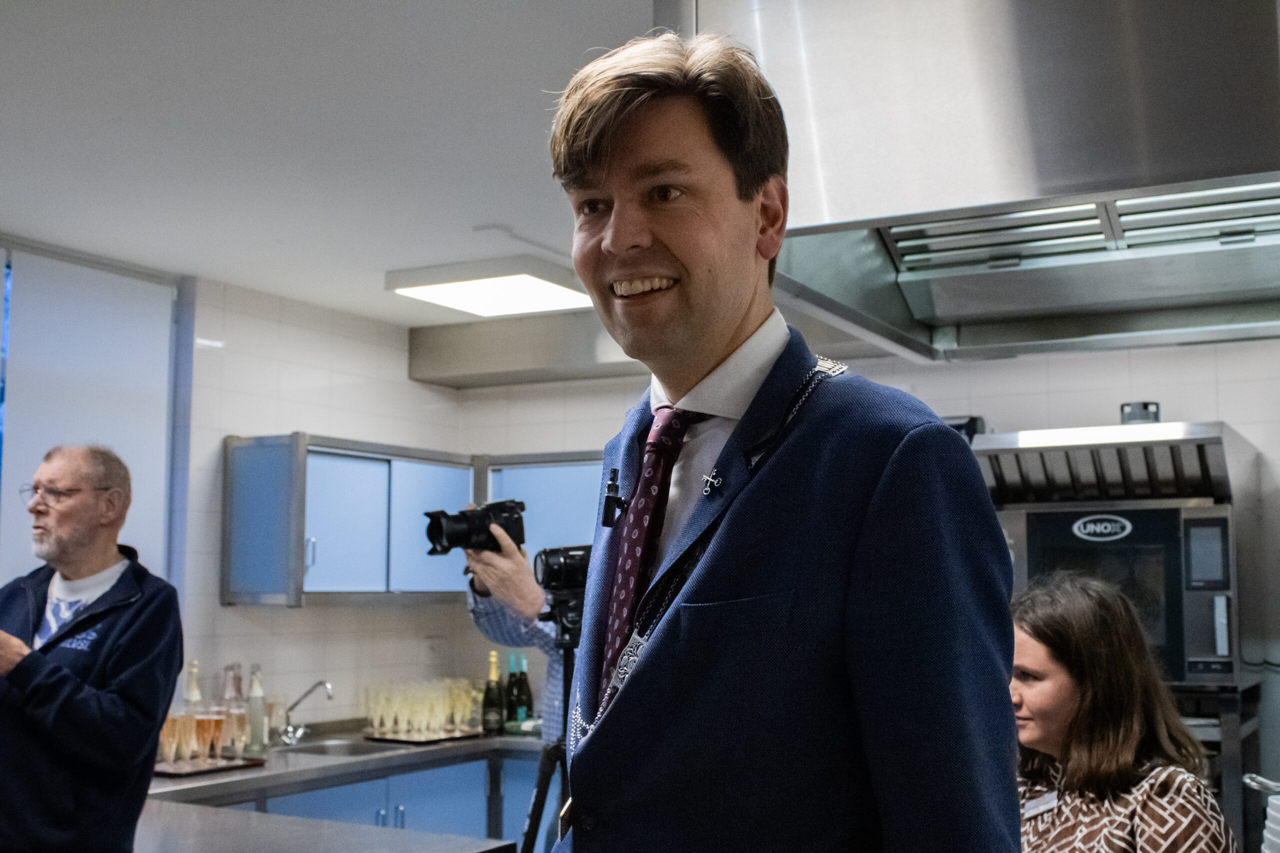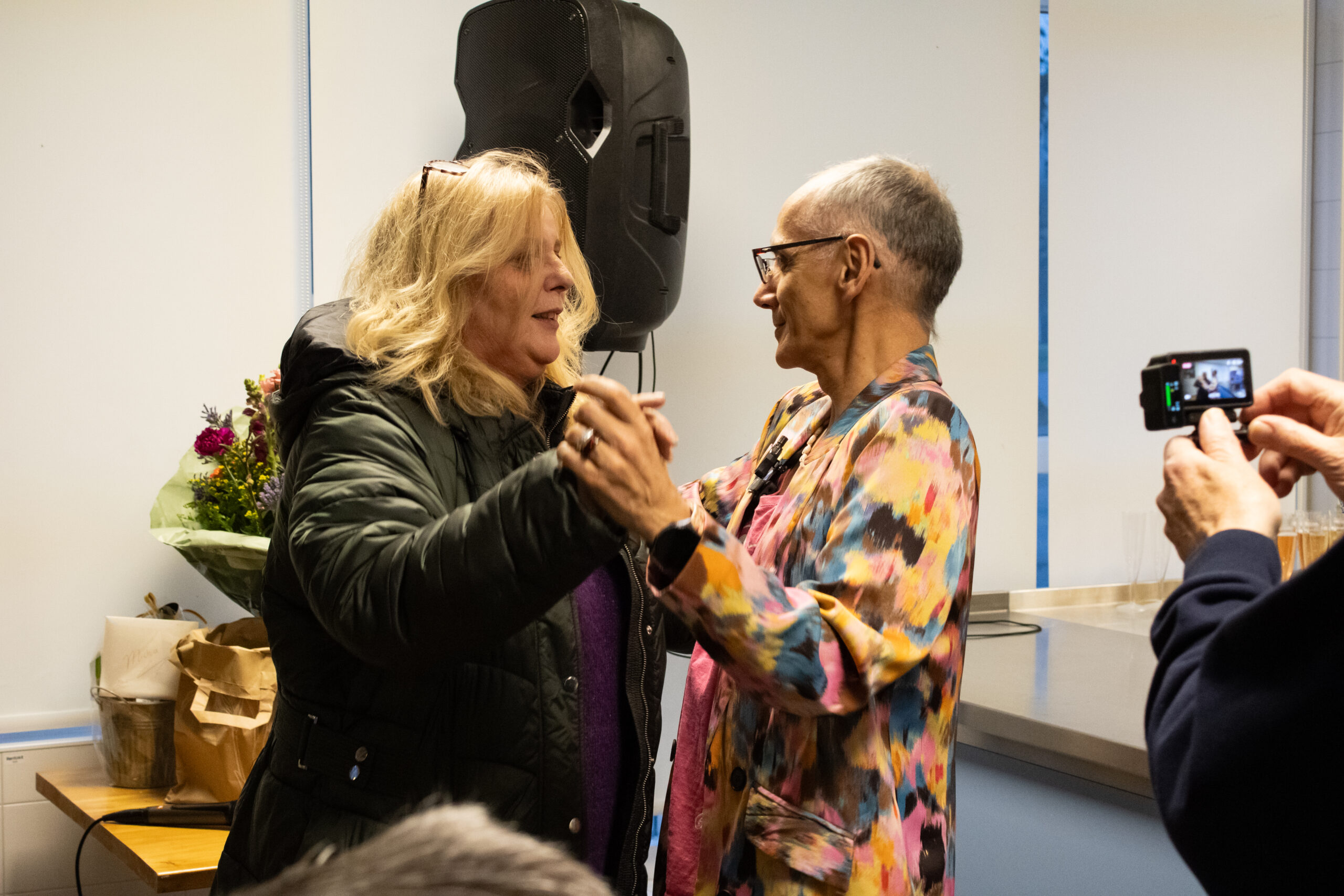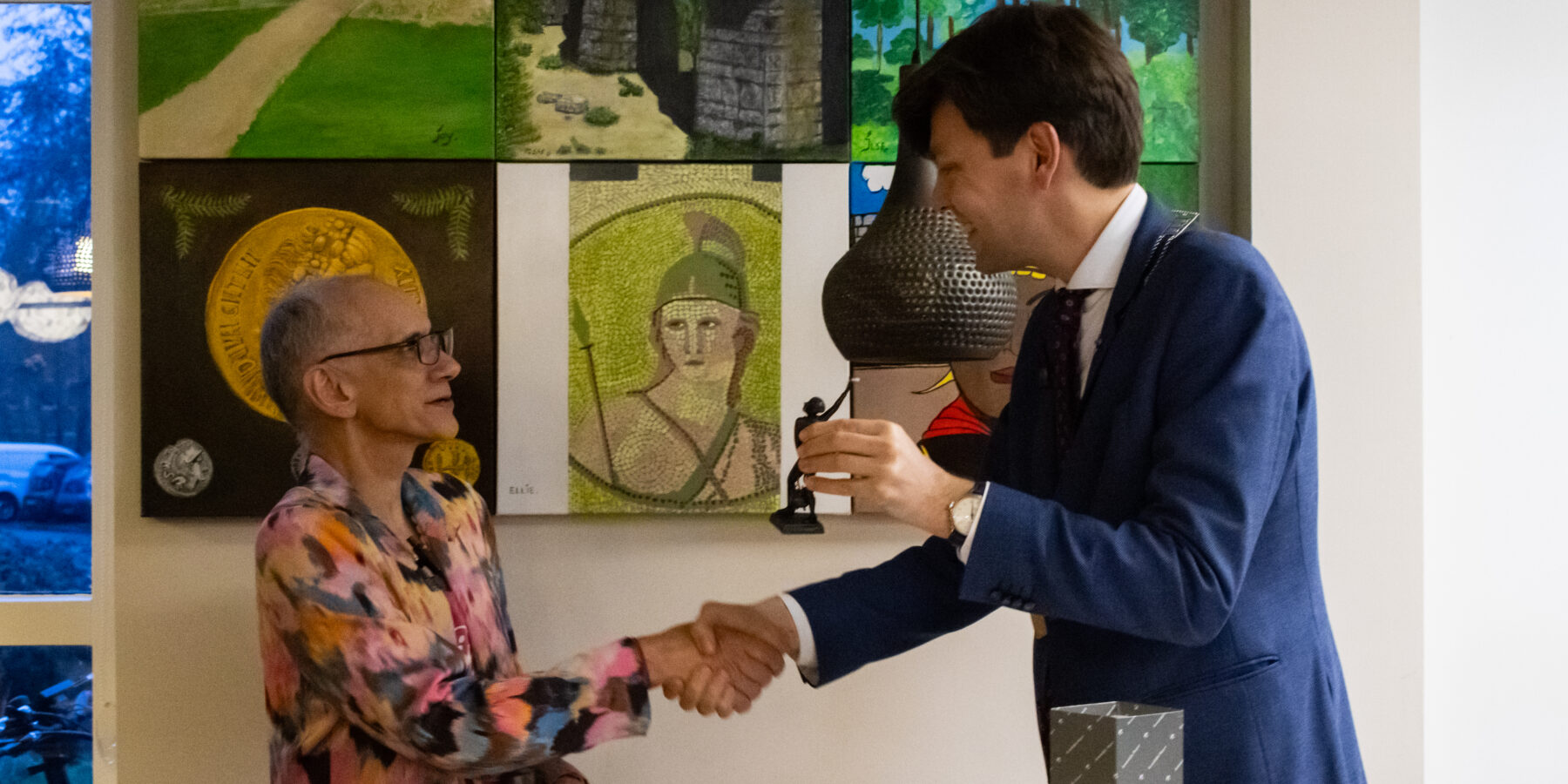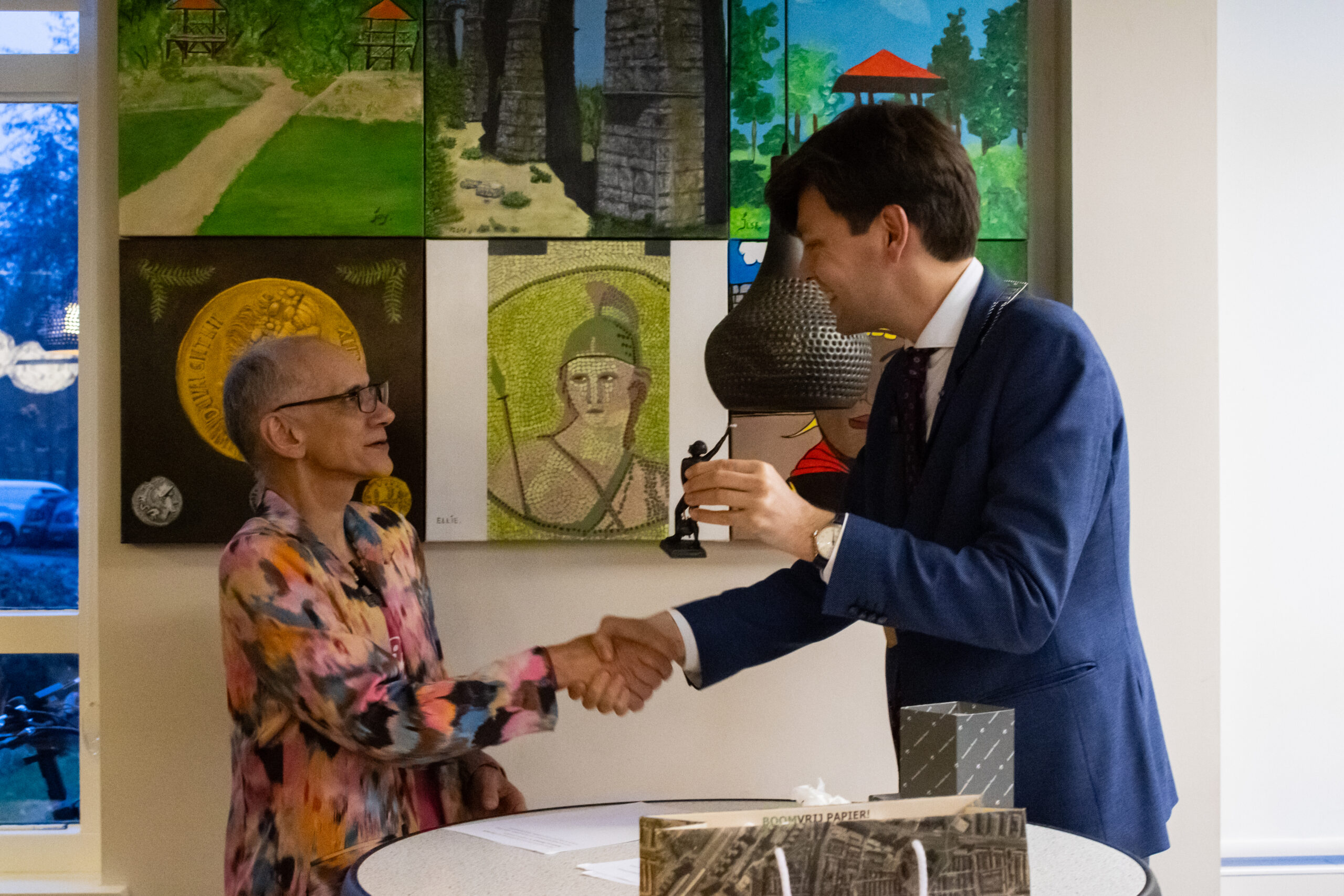 Verslaggever Jennifer Wijnen in gesprek met locoburgemeester Julius Terpstra over het onderscheiden van het Cornelis Joppensz Beeldje