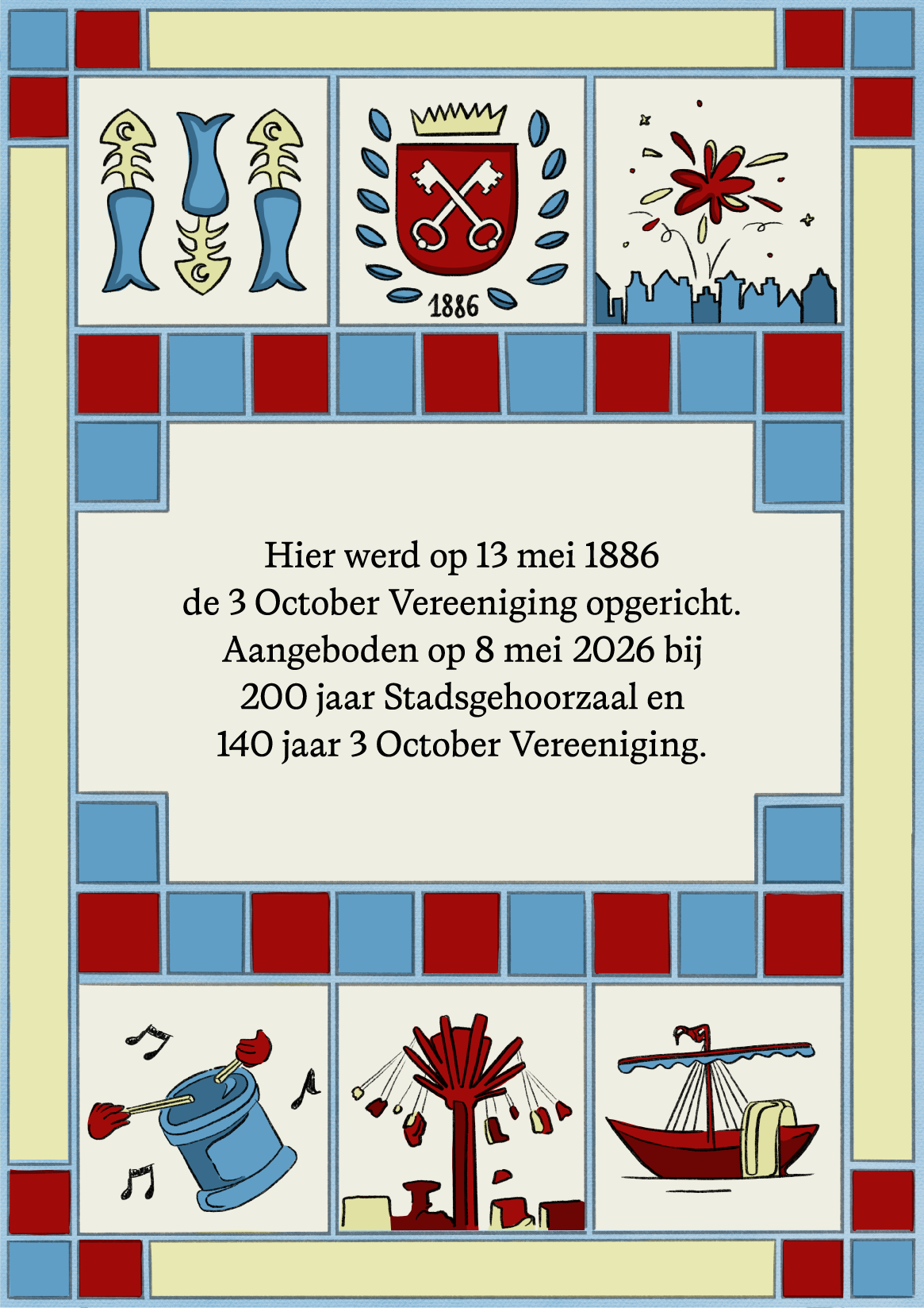 Ter ere van deze gezamenlijke jubilea schreef de vereniging een wedstrijd uit voor het ontwerp van een plaquette die aan de gevel van de Stadsgehoorzaal aan de Breestraat komt te hangen. Met hun kleurrijke ontwerp zijn de twee Leidse makers als winnaars uit de bus gekomen.