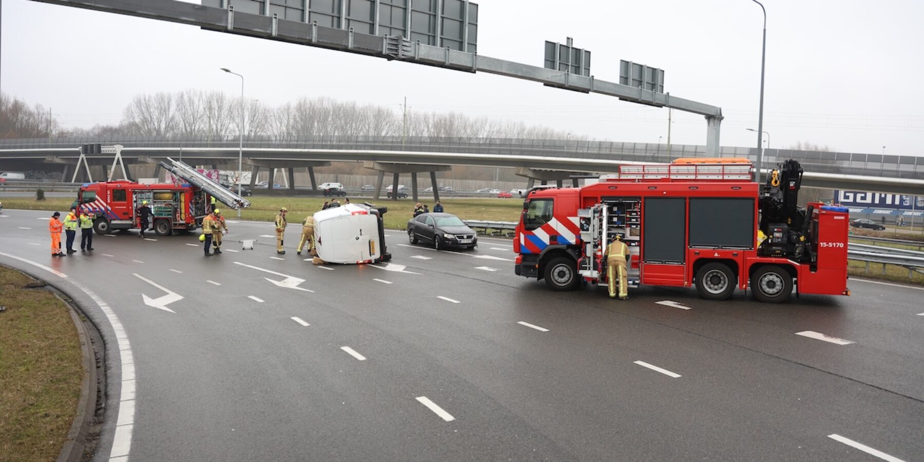 Rijkswaterstaat sloot de afrit vanaf het Prins Clausplein direct af met rode kruizen. Verkeer dat al vaststond in de bocht werd door de politie langs het ongeval geleid, terwijl ander verkeer werd omgeleid. De brandweer kwam ter plaatse om de bestuurder van de bestelbus te bevrijden. Door een opening in het dak te zagen, kon de man uit het voertuig worden gehaald en is hij na eerste hulp naar het ziekenhuis vervoerd. De vijf inzittenden van de personenauto bleven ongedeerd.