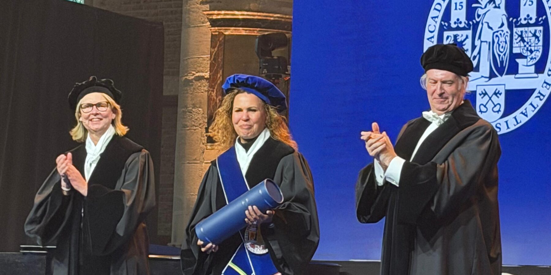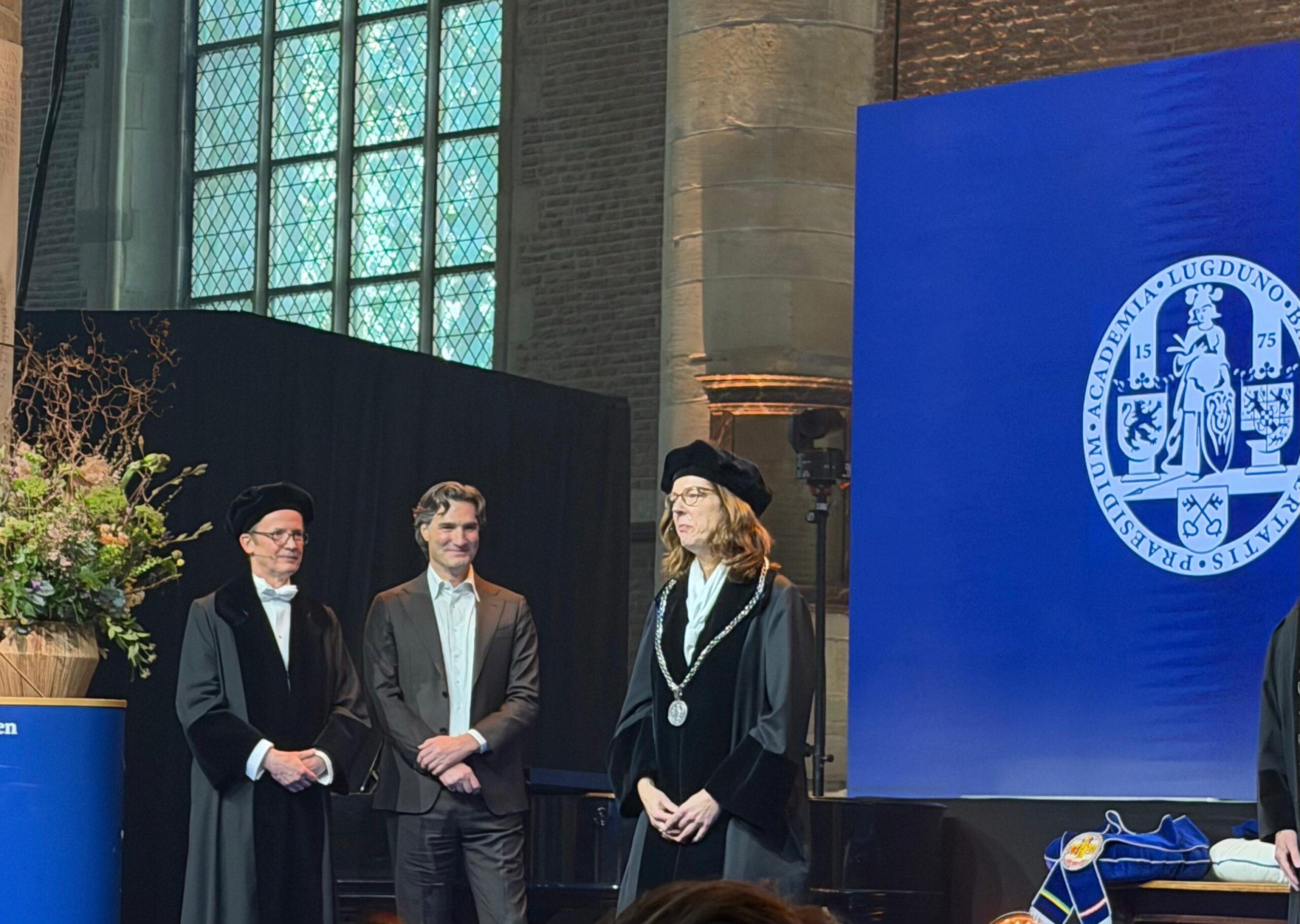 De universiteit heeft nieuw college van bestuur. De bezoekers van de dies kregen de kans om kennis te maken met Timo Kos, sinds maart 2025 vicevoorzitter, de nieuwe voorzitter Luc Sels en rector magnificus Sarah de Rijcke.