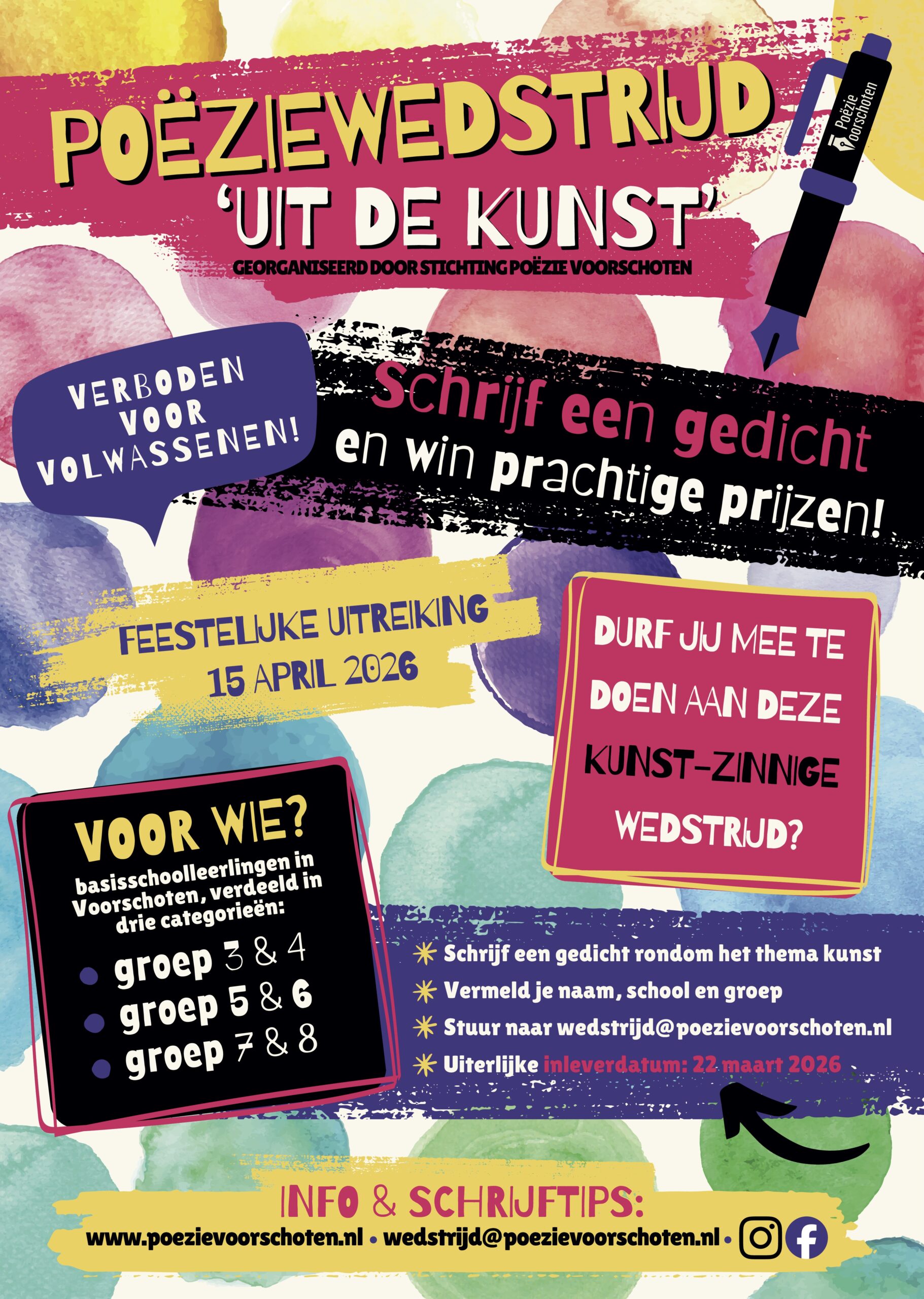 Aanmelden kan via wedstrijd@poezievoorschoten.nl. Gedichten kunnen ook worden ingeleverd bij Museum Voorschoten. De uiterlijke inleverdatum is 22 maart 2026. Op 15 april zal er een feestelijke uitreiking plaatsvinden in De Grote Zaal van het Bondsgebouw, waarbij kinderen hun dichtkunst mogen voordragen aan het publiek.