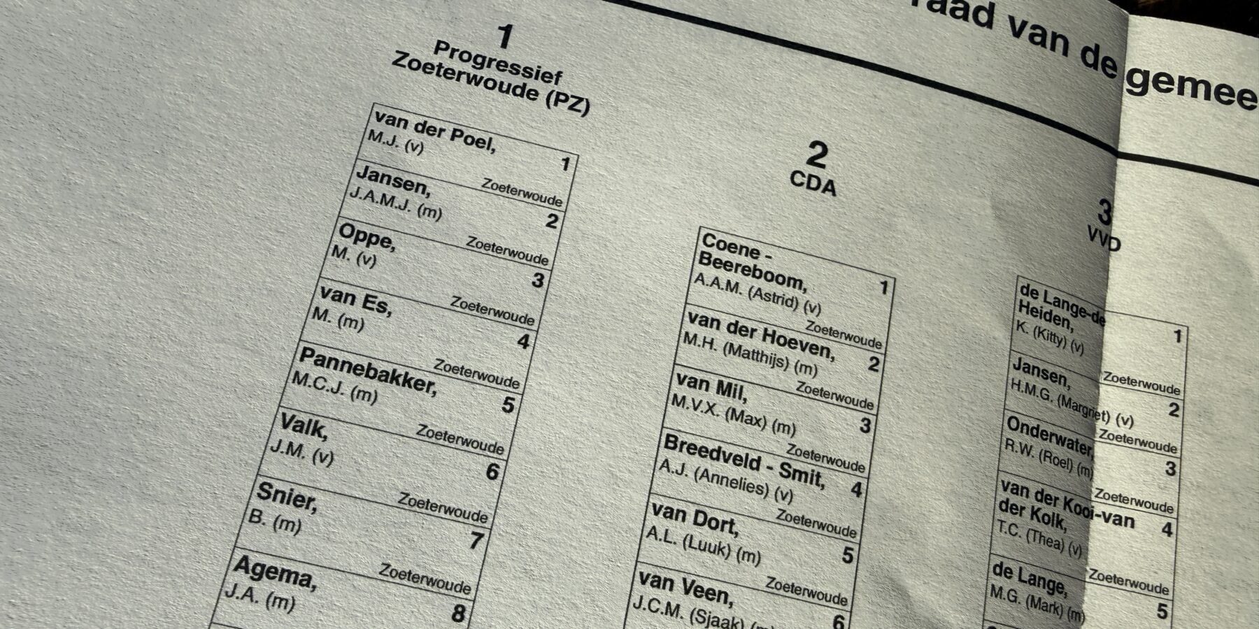 Kandidaatraadsleden van politieke partij Progressief Zoeterwoude (PZ) reageerden donderdag verbaasd op de kieslijst voor de komende gemeenteraadsverkiezingen. Ter voorbereiding op de verkiezingen vielen de lijsten bij alle inwoners op de deurmat. Maar wat blijkt: bij de leden van PZ staan, als enige partij, alleen voorletters vermeld.