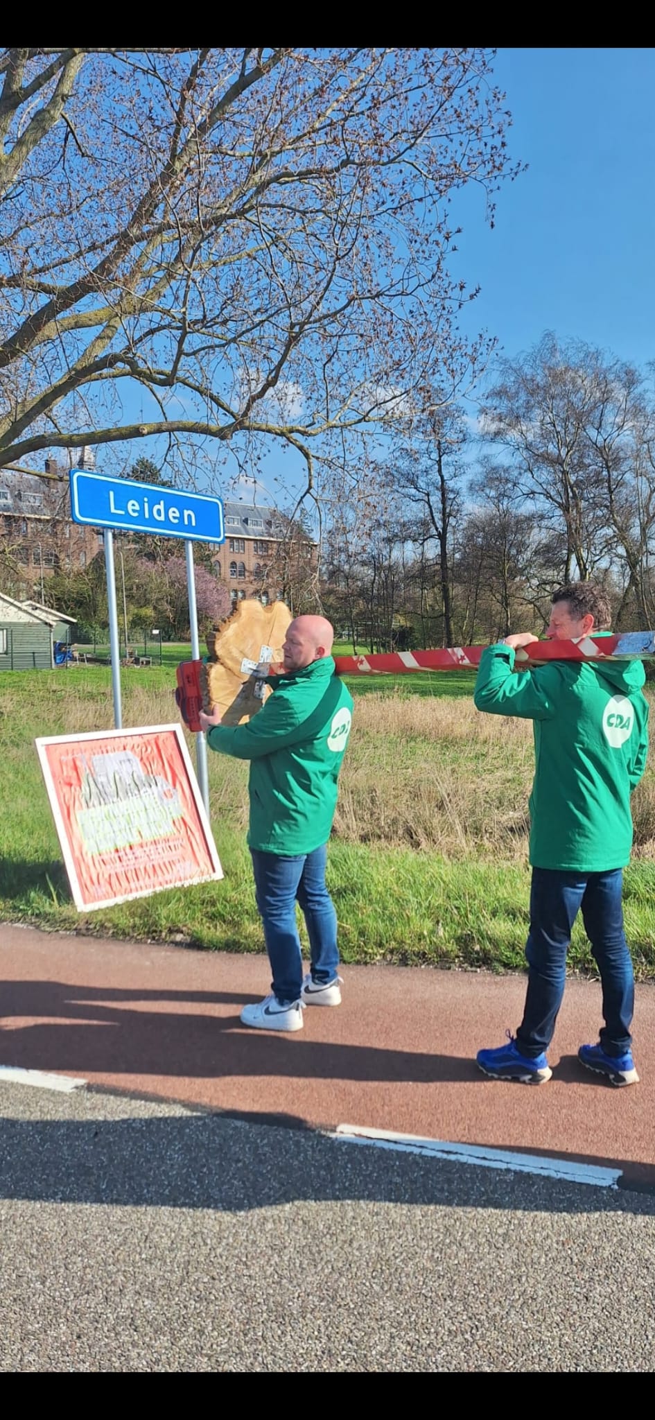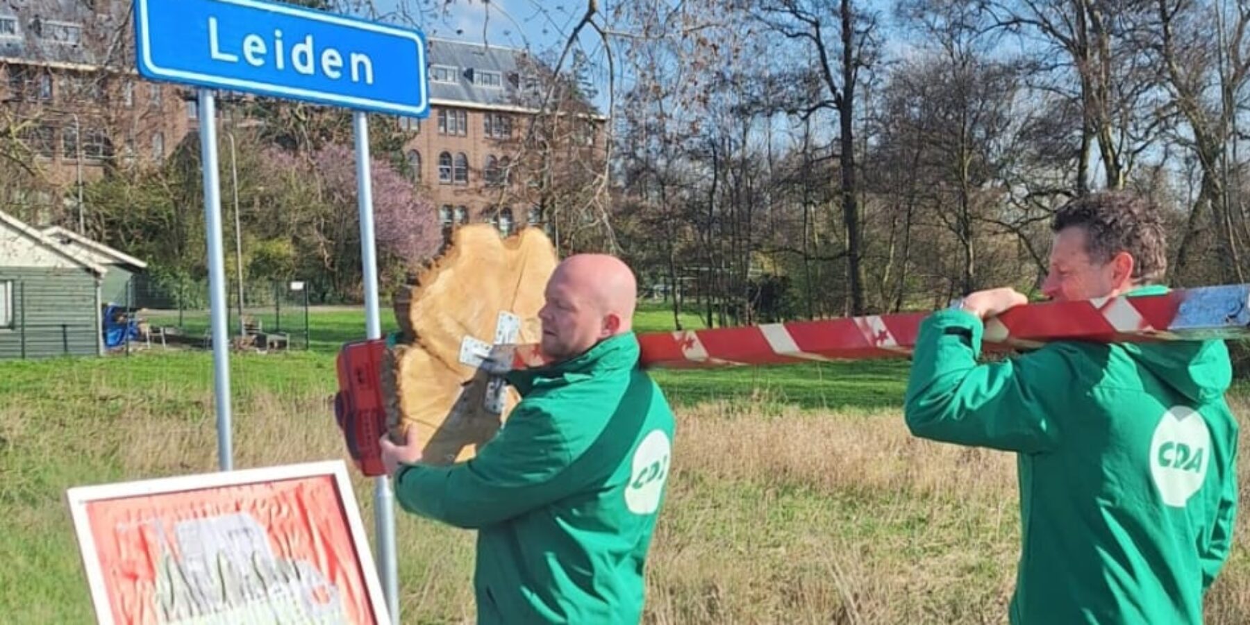 Samen met raadslid Max van Mil sjouwde Van der Hoeven het campagnebord met paal en al terug de grens met Leiden over. “Terug de ‘Calvarieberg’ over naar het Leidse grondgebied van de Vrouwenweg.” Om de boodschap extra kracht bij te zetten voorzag de CDA Zoeterwoude fractie het nog van een briefje (zie foto).
