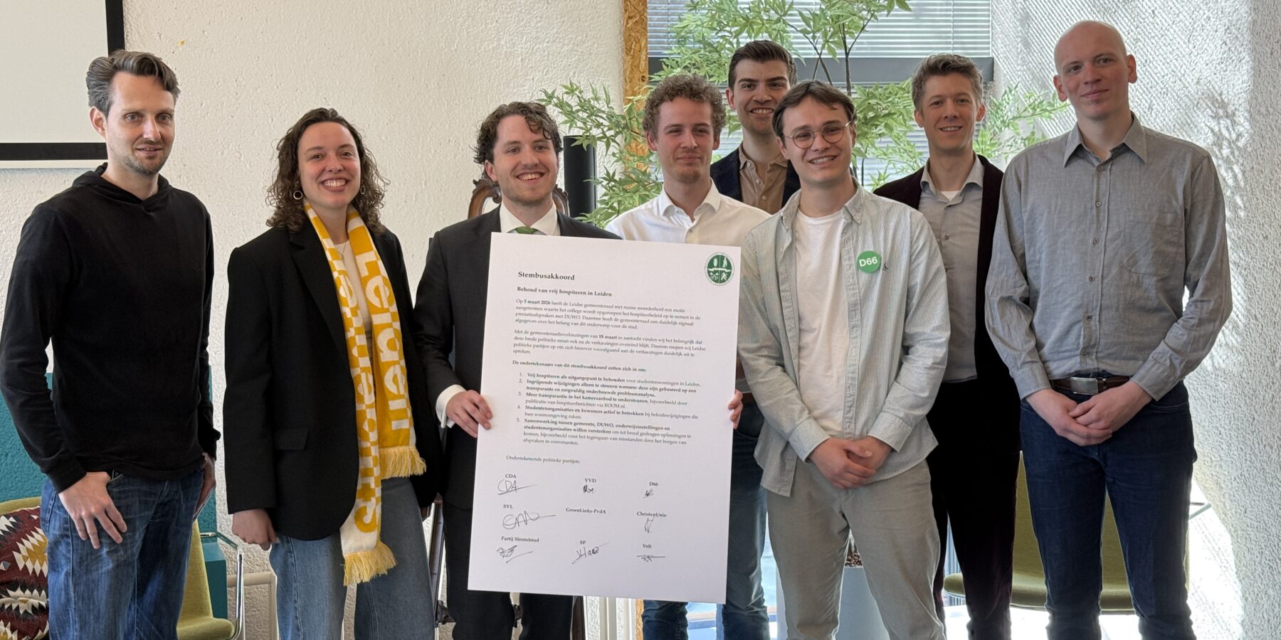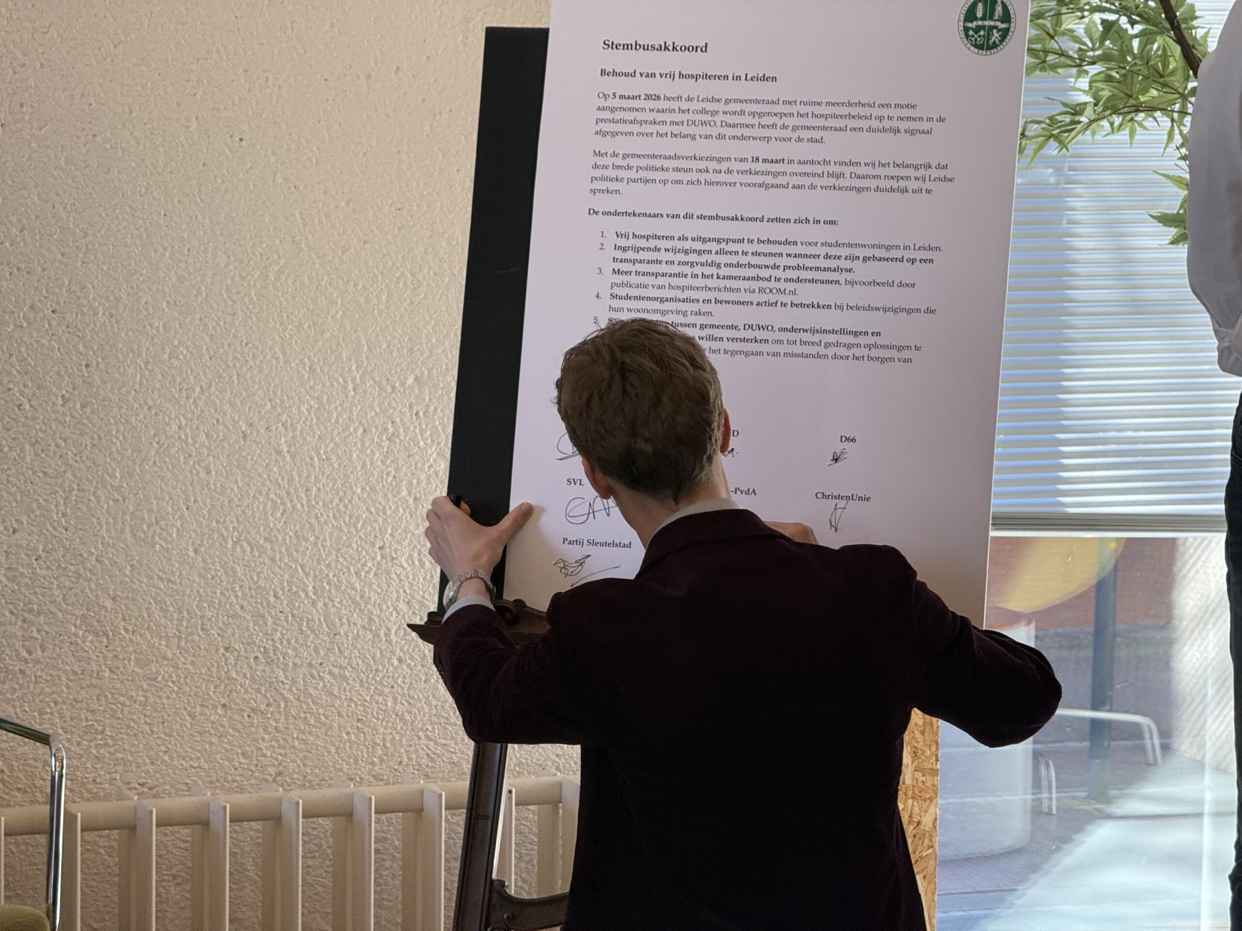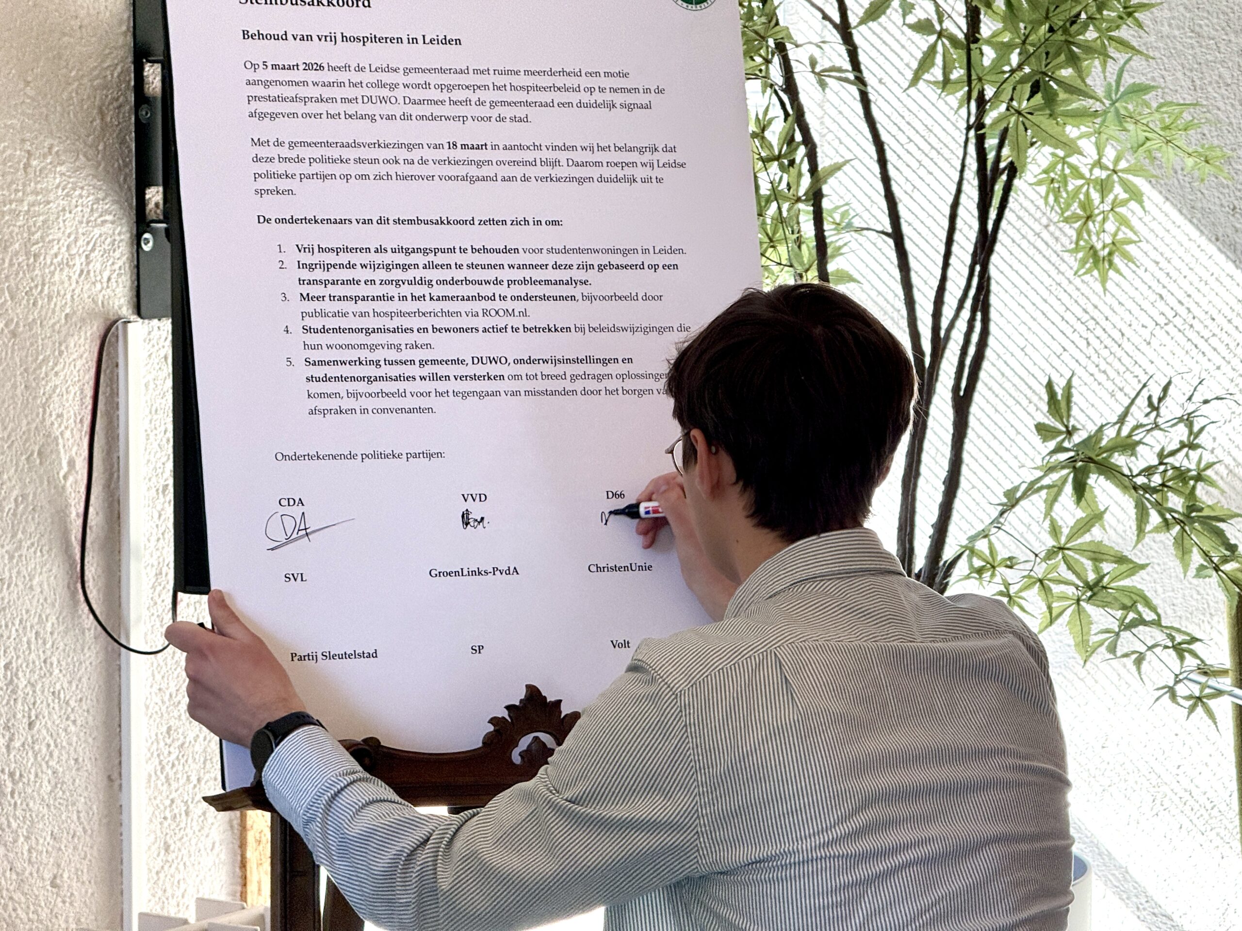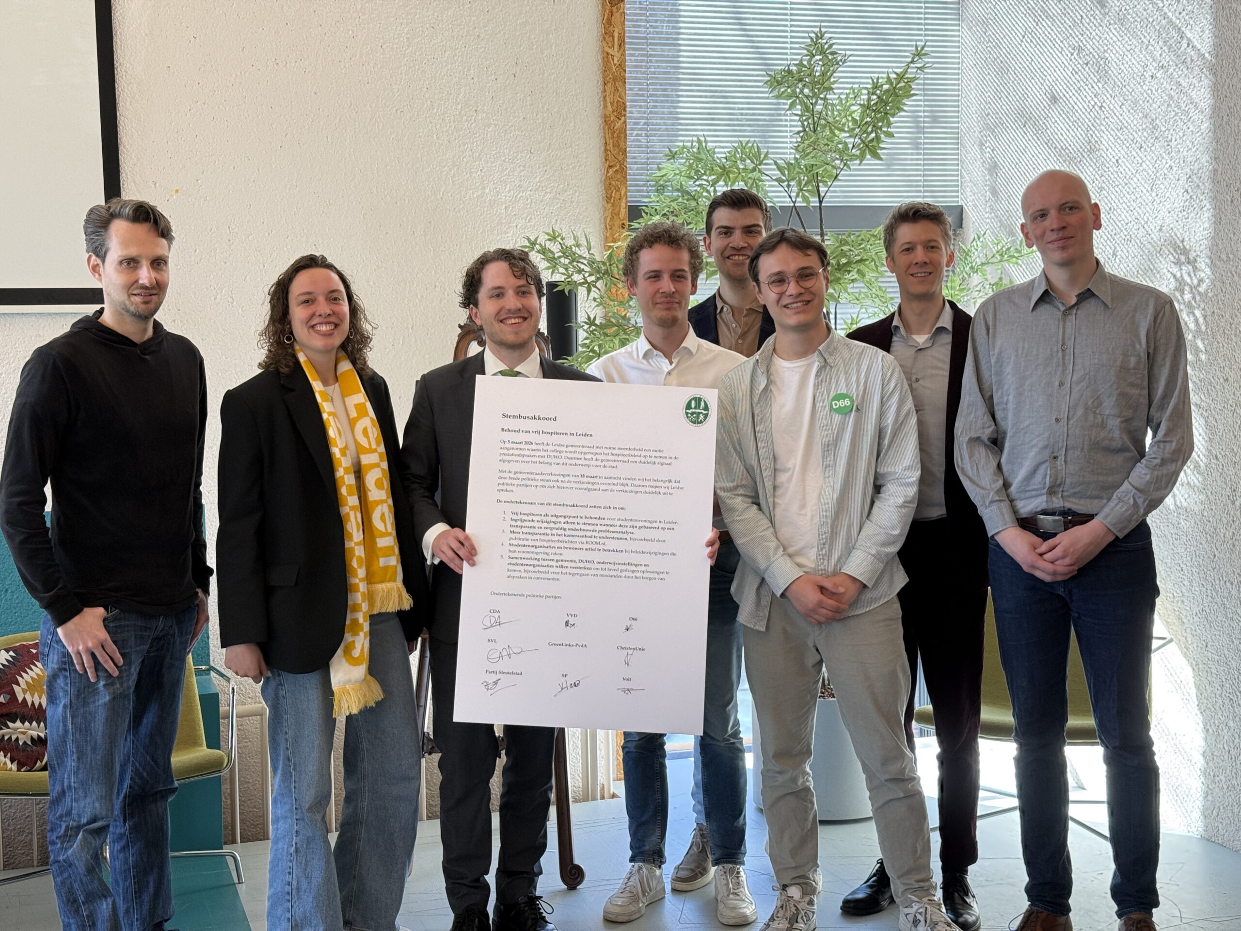 Op de dag van de gemeenteraadsverkiezingen, hebben acht Leidse politiekepartijen een stembusakkoord getekend over hospiteren. De ondertekenaars beloven, onder toeziend oog van de Plaatselijke Kamer van Verenigingen in Leiden (PKvV) dat ze zich, ook na de verkiezingen, aan de eerder gemaakte afspraken rondom hospiteren zullen houden. Met andere woorden: dat vrij hospiteren in DUWO-huizen blijft bestaan.