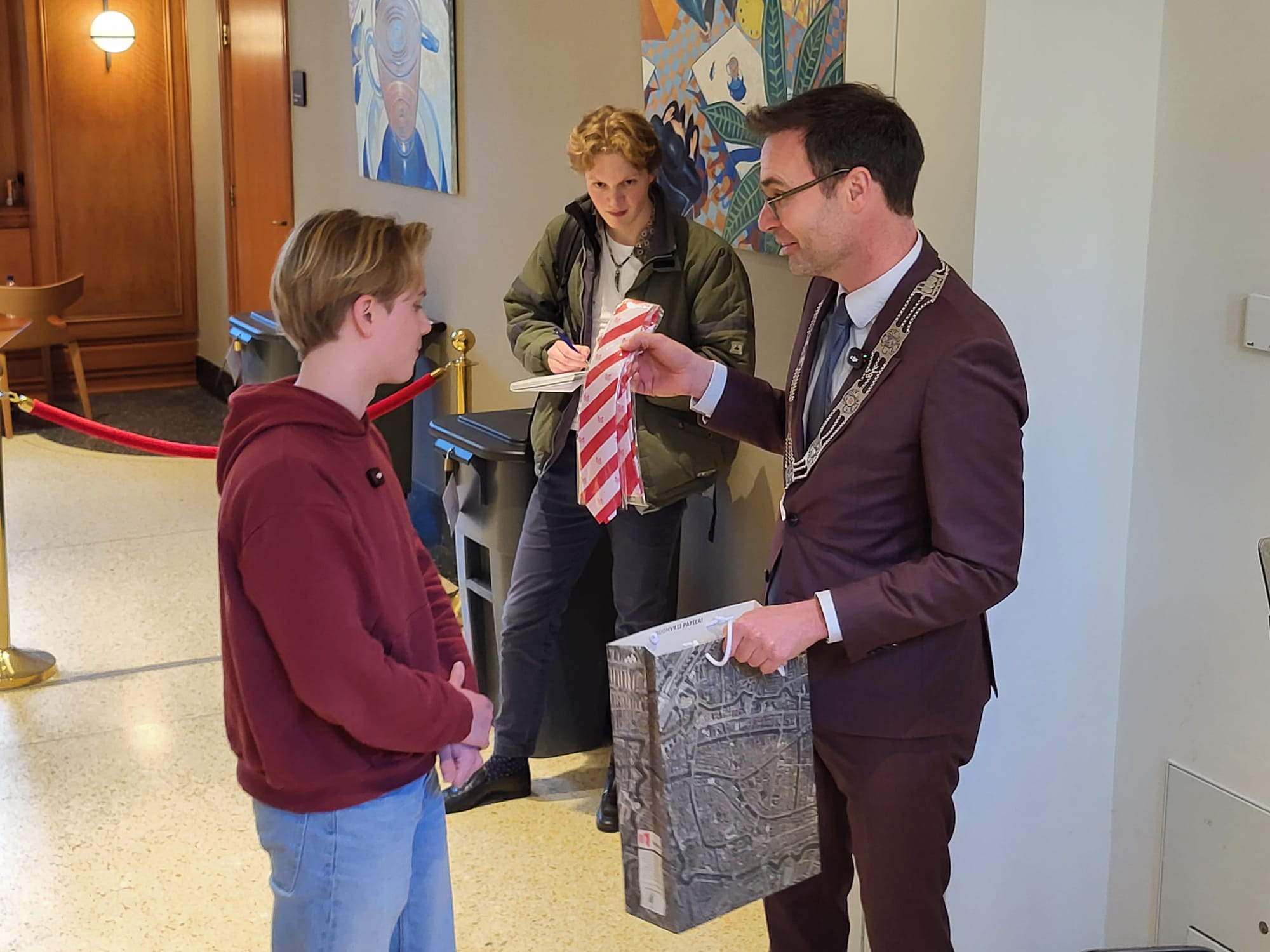 Bij een verjaardag horen natuurlijk cadeautjes, en die had de burgemeester meegenomen. Hij overhandigde een tasje aan Tim met daarin een Leidse mok, een rood-witte stropdas en een spelletje.