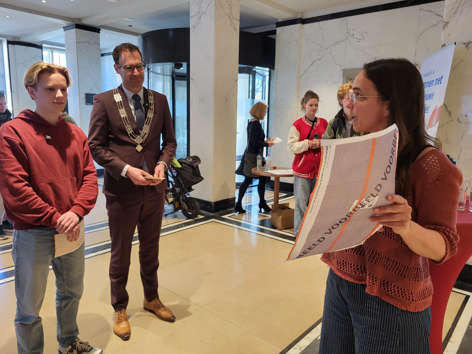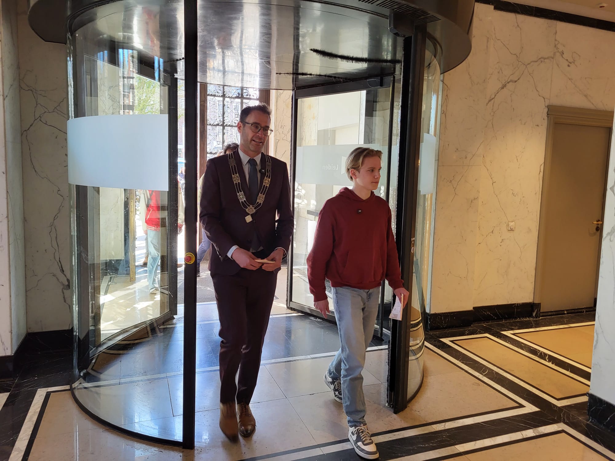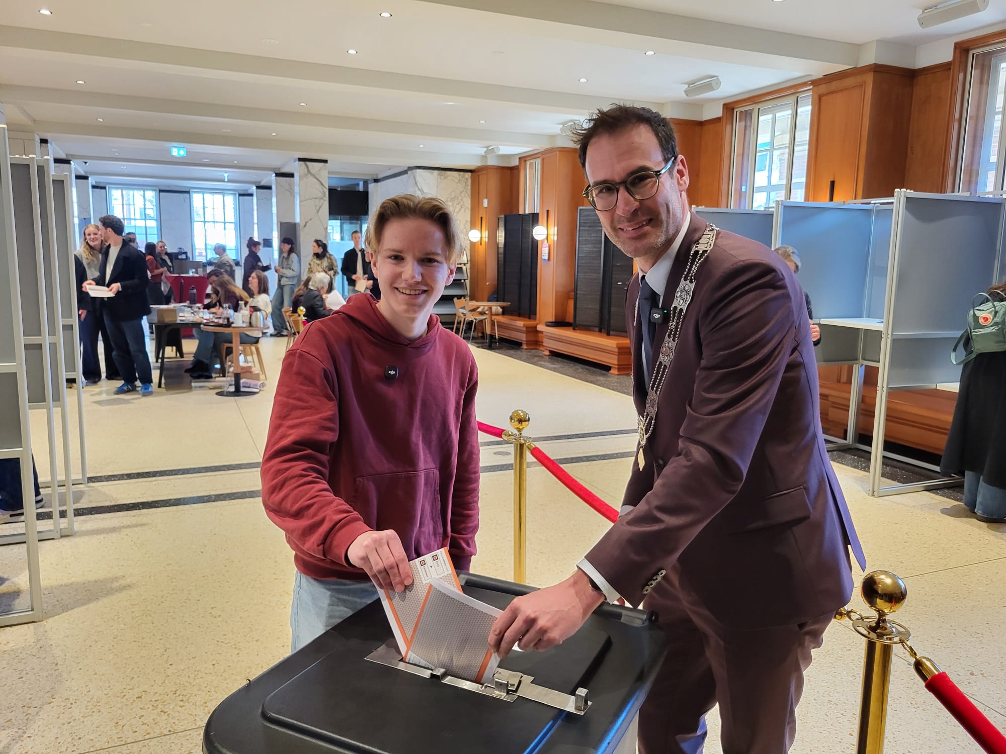 De burgemeester ontving Tim en zijn gezin op het bordes van het stadhuis. Bij aankomst speelde het carillon verjaardagsliedjes. “Ik heb ook nog voor hem gezongen, dat was een minder groot succes,” grapt de burgemeester. Na het ontvangst ging de groep samen door naar de stadsfoyer waar de burgemeester en Tim hun stem uit konden brengen.