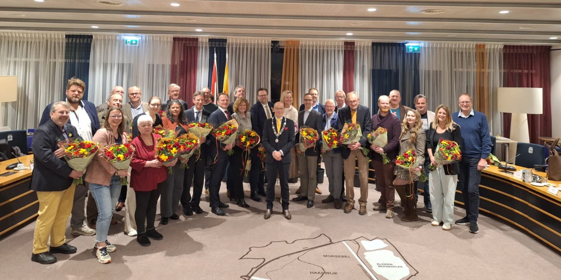 “Het is een feestelijke avond”, zei burgemeester Emile Jaensch. Op de agenda was deze vergadering wel aangeduid als ‘raadsvergadering’, maar deze bijeenkomst was heel anders dan een normale raadsvergadering. De zaal was gevuld met vrienden en familieleden van raadsleden en voor de raadsbanken stond een rij bloemboeketten.