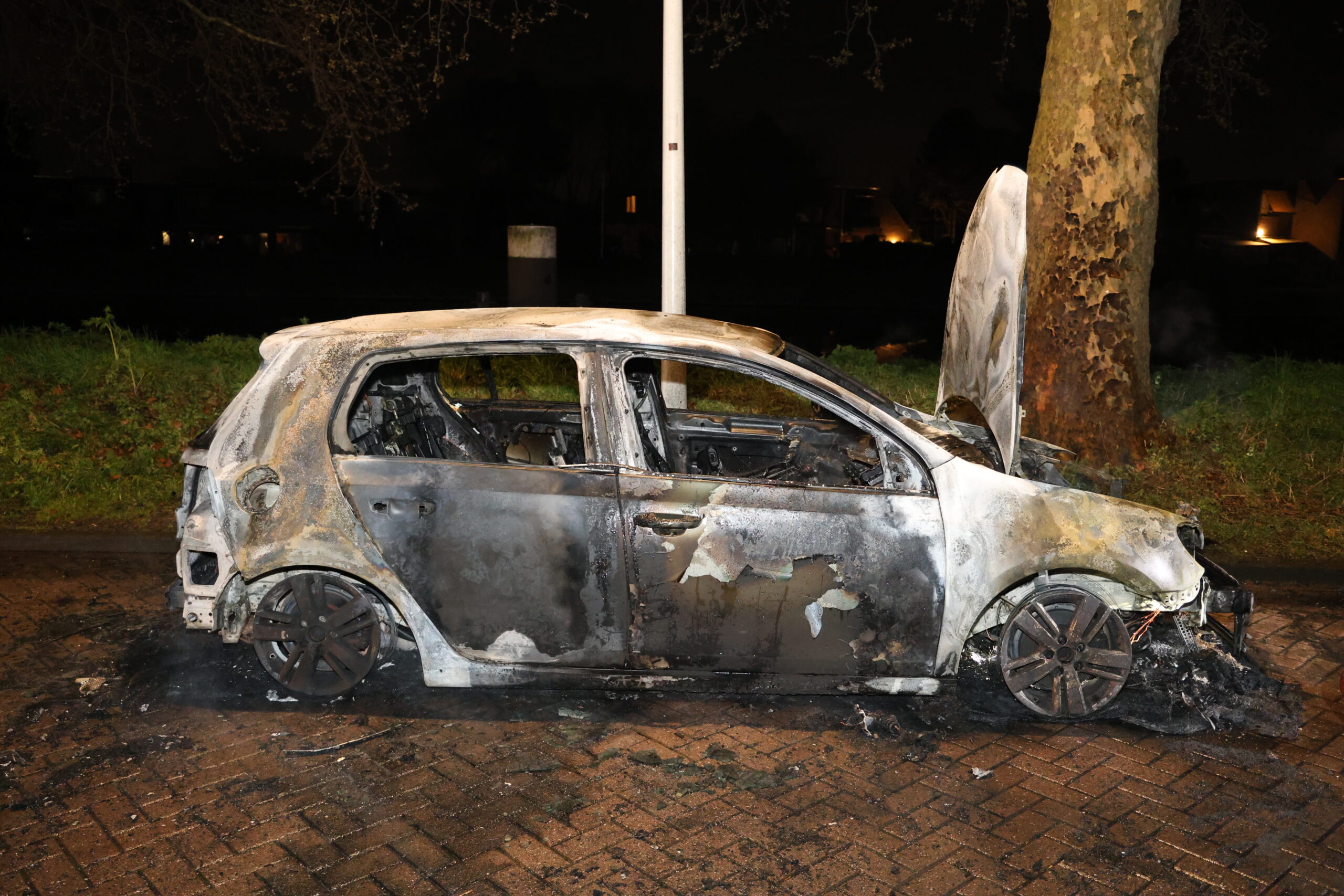 Een geparkeerde auto brandde woensdagavond volledig uit op Admiraal Banckertweg in Leiden.