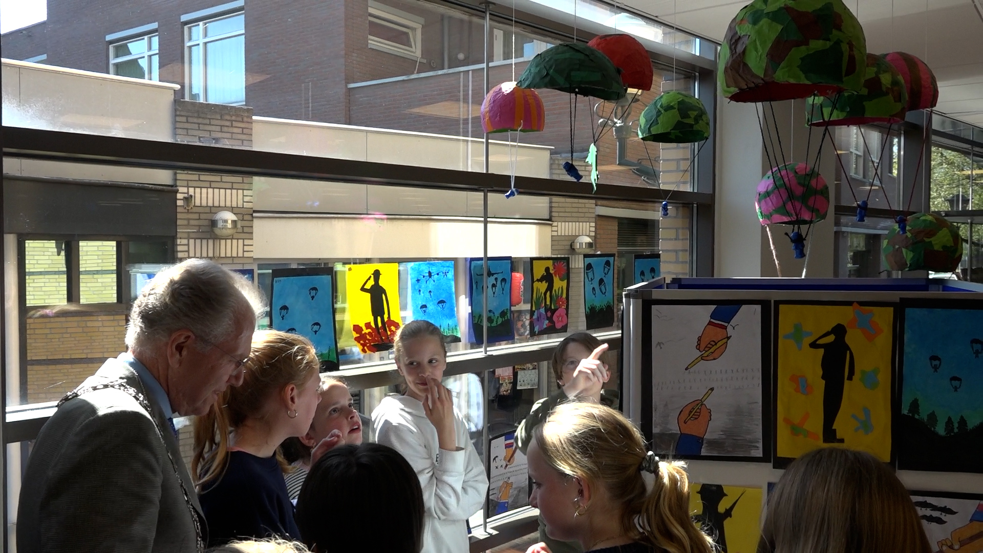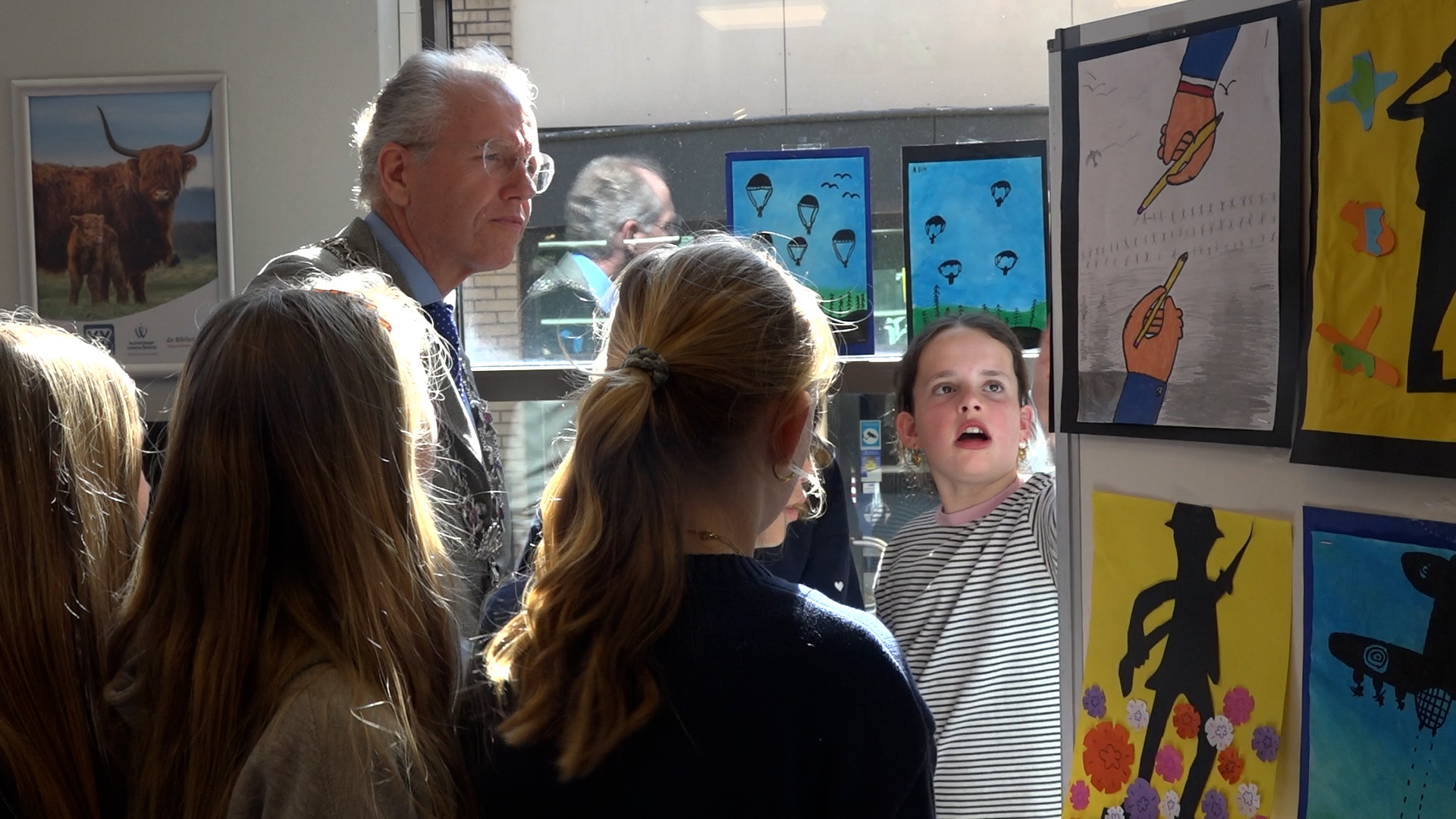 Burgemeester Leendert de Lange was aanwezig bij de opening van de tentoonstelling. Op 1 april gaf de burgemeester ook een gastles op de school die in het teken stond van de Tweede Wereldoorlog. “En door kinderogen tonen ze nu hoe belangrijk het is om stil te staan bij de verschrikkingen van de oorlog en dat we dat natuurlijk nooit meer willen,” aldus de burgemeester.