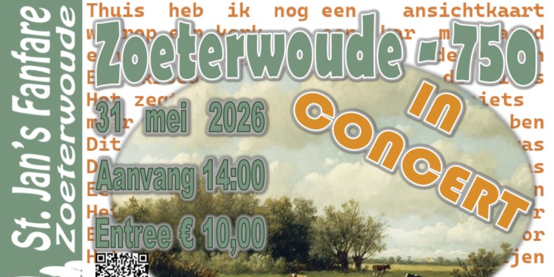 Op zondag 31 mei om 14:00 uur neemt de St. Jan’s Fanfare u mee op reis, in klank en beeld, door de geschiedenis van Zoeterwoude. We ontmoeten onder andere graaf Floris de V, kijken terug naar hoe het land in en om Zoeterwoude zich heeft ontwikkeld en werpen een blik op het dorp rondom de Tweede Wereldoorlog. Om te vieren wat Zoeterwoude nu is, wordt de middag met een aantal feestelijke nummers afgesloten.